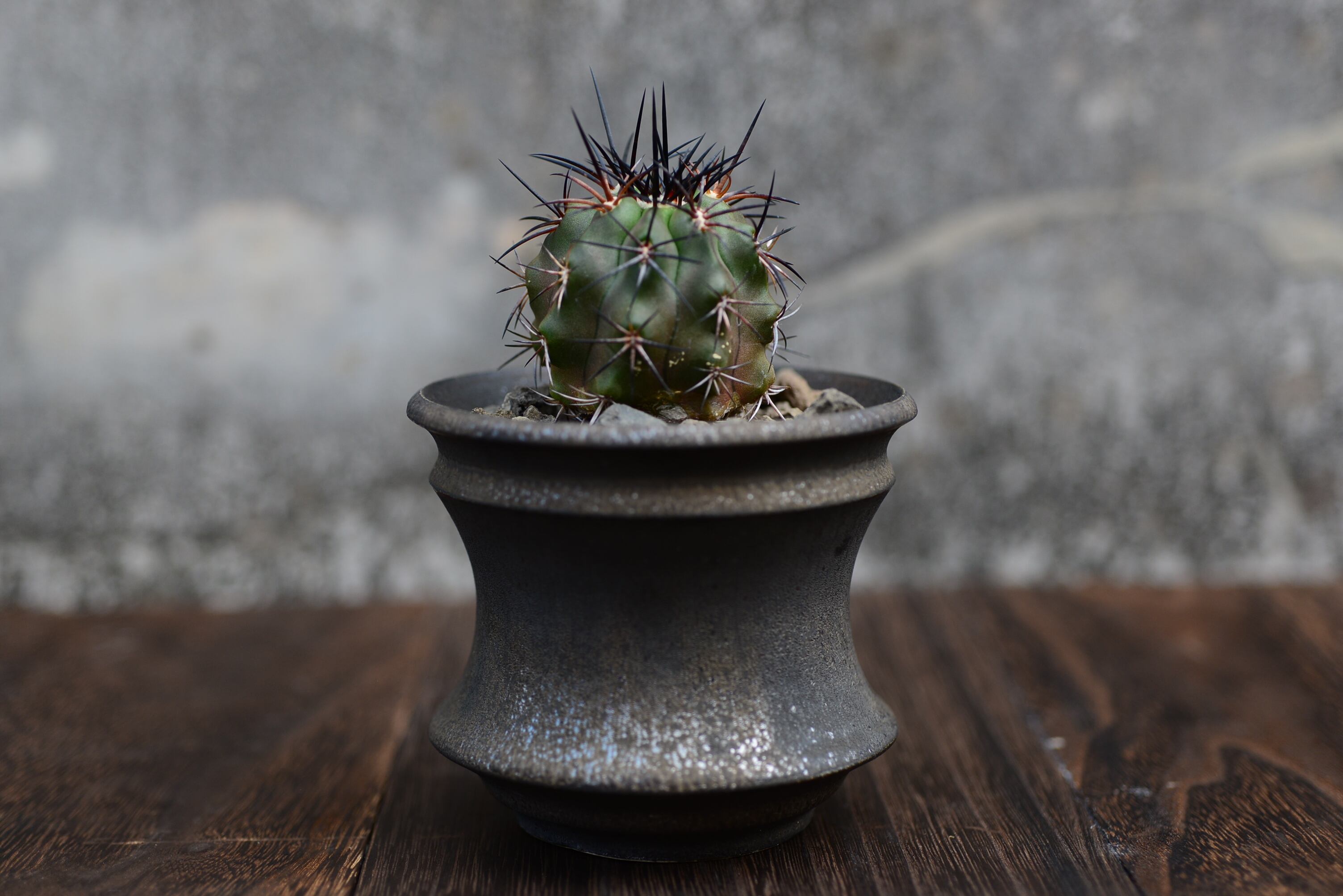 黒い棘と緑紫でボリュームのあるボディがとても格好いい個体で、鉢とのバランスも抜群です。